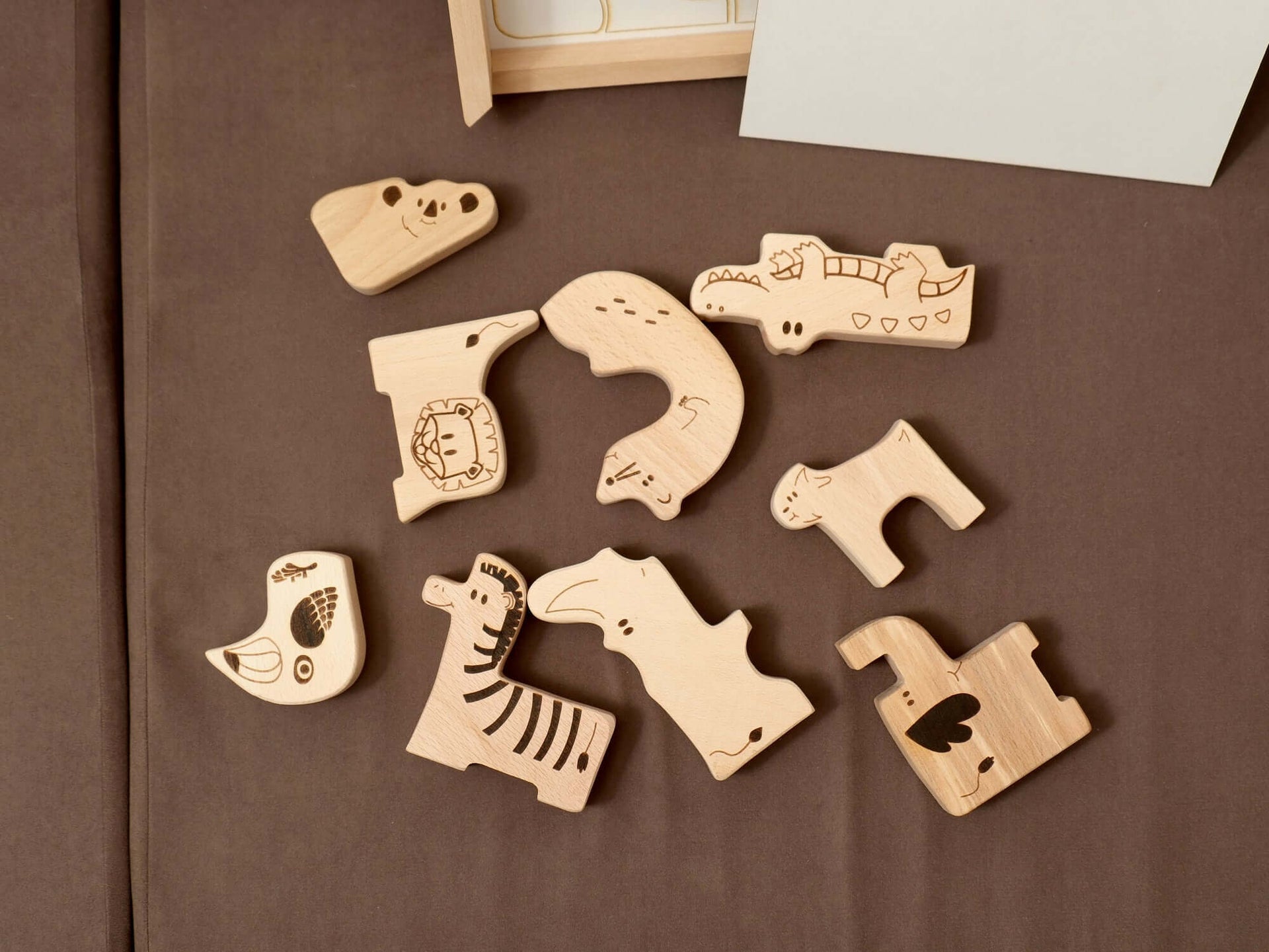 Perfectly crafted for hands-on learning, this Montessori-inspired Wooden Safari Animal Puzzle Box offers a fun, eco-friendly way for toddlers to explore and develop their skills. This 9-piece set features beautifully handcrafted safari and woodland animals—lion, toucan, rhino, crocodile, goat, koala, otter, elephant, and zebra—nestled in a sturdy, high-quality wooden box.